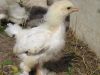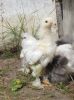 Sort 3 uger gammel silkekylling i forgrunden og 3 uger gammel Brahma i baggrunden