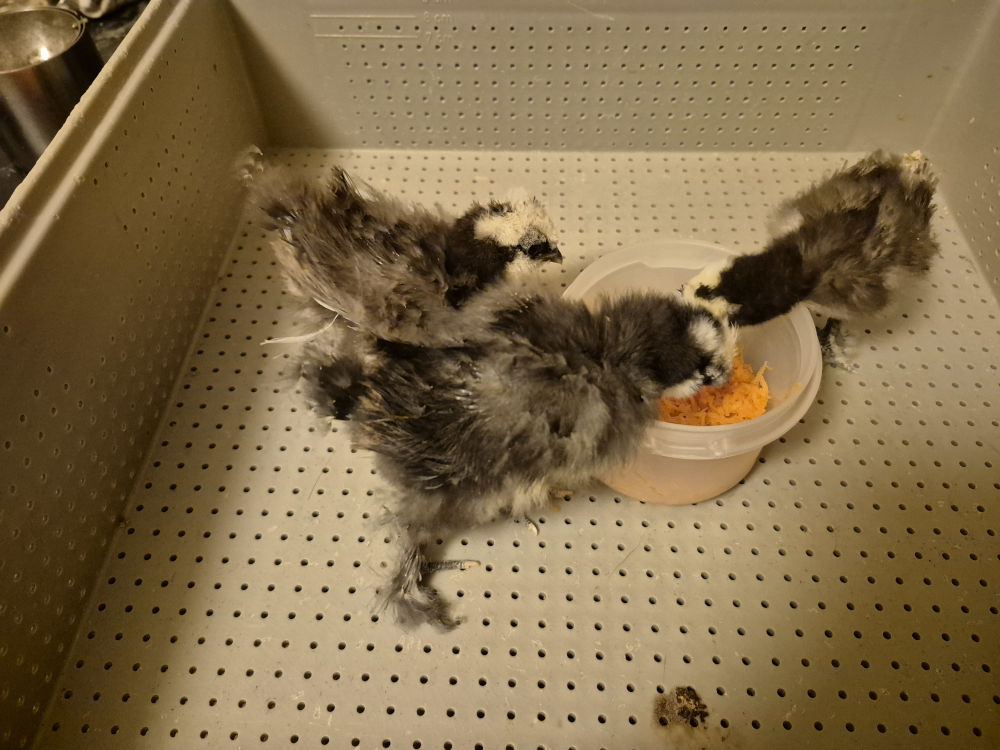 0.1 wyandot, 0.6 araucana, 3.5 dværgsilker (hanerne enes), 3x dværgsilke kyllinger