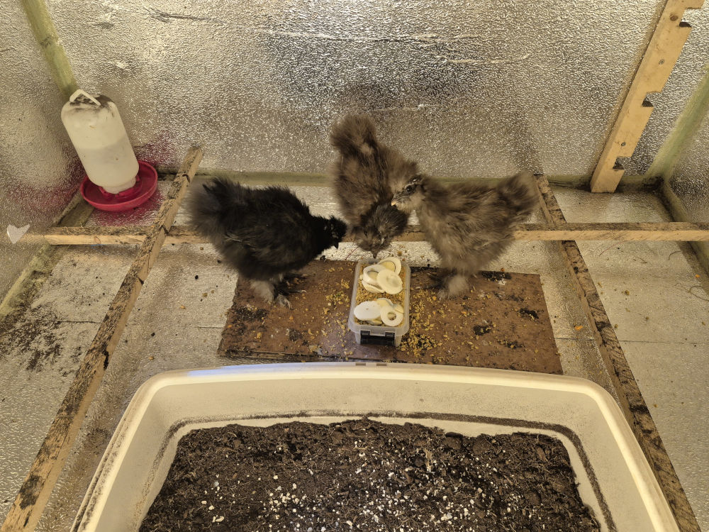 Jeg har for første gang droppet avisunderlaget, da de nu bare skraber det i stykker over det hele. Så må vi se om det er lige så nemt at renholde som før. Jeg burde egentlig give dem halm eller spåner, men har ikke noget hjemme i øjeblikket.